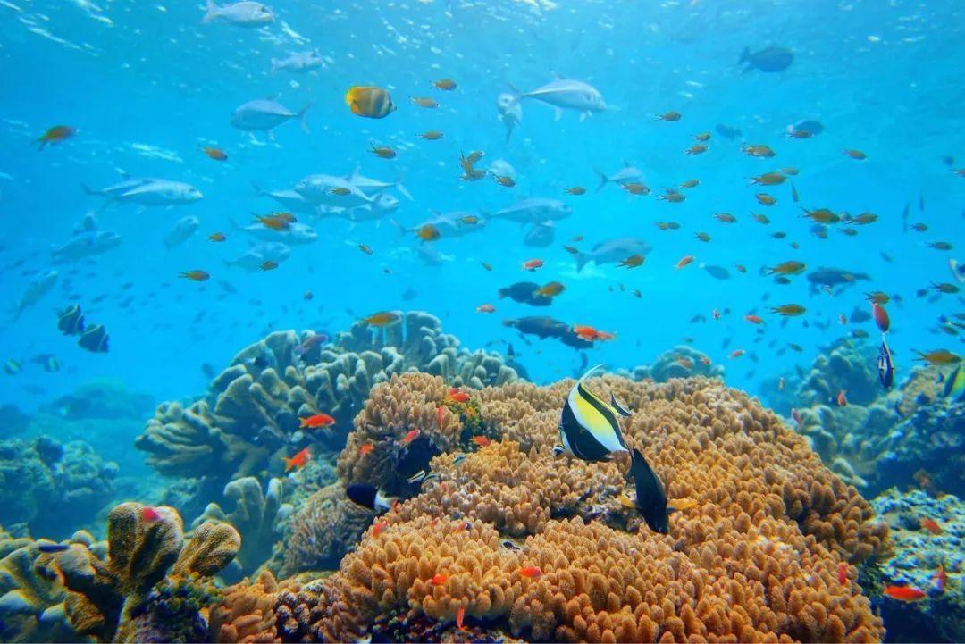 大海龟缓慢划过,鱼群飞速游动往前,在这片碧海蓝天里,有着足以媲美大堡礁的珊瑚胜景,珊瑚之间还藏着无数不知名的鱼类。