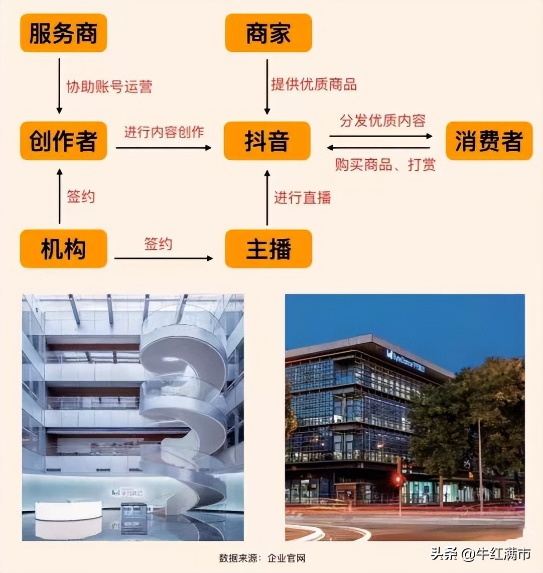 创作者进行内容创作,靠广告和产品售卖获取收益,主播进行直播,靠打赏和带货获取收益。服务商和机构靠服务和签约主播创作者,获取收益的分成。商家给平台提供优质商品,赚取商品售卖的收益。平台则对相关环节的营收进行抽成。