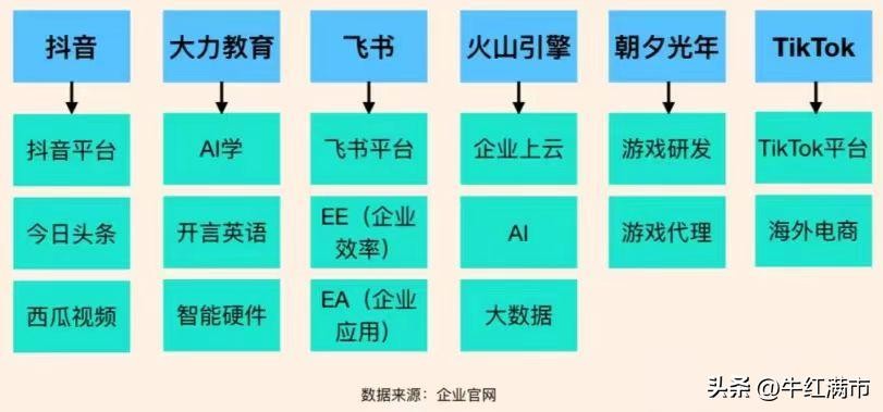 字节从2021年11月开始,公司实行业务线BU化,成立了六个业务板块,分别是抖音,负责国内信息与服务,大力教育,负责教育服务,飞聚焦企业协作与管理,火山引擎,专注于企业服务云平台,朝夕光书,年,主攻游戏板块,和TikTok,负责海外业务。