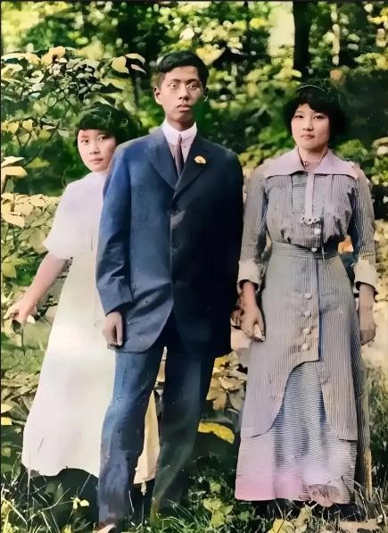 1911年,宋美龄和宋子文,宋庆龄的珍贵合影。那时宋美龄14岁,宋子文17岁,宋庆龄18岁。宋美龄和宋子文脸上还带有青涩,宋庆龄则已透出优雅高贵的气质。