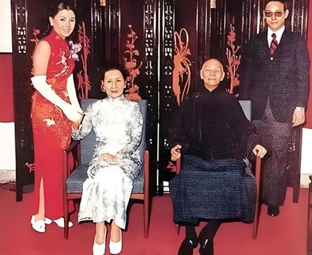 1973年,宋美龄和蒋介石在孙子蒋孝勇婚礼上的罕见合影。这年宋美龄76岁,蒋介石86岁。宋美龄的身体非常健康,而蒋介石的身体大不如从前,尤其是发生车祸之后,他的身体日渐衰弱,他已经无法独自站立了。