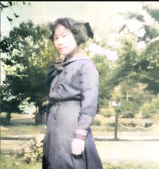 1910年,宋美龄在美国威尔斯利女子学院读书时的罕见照片。这时的宋美龄刚到美国读书不久,她身穿长裙,盘着头发,别看年纪不大,眼神却很犀利。
