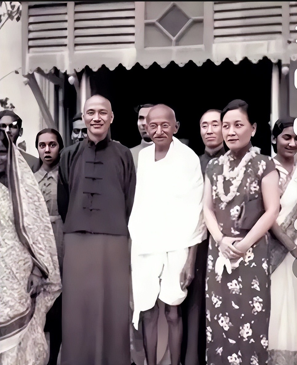 1942年,宋美龄,蒋介石和甘地在印度的罕见合影。这年宋美龄45岁,蒋介石在前往印度视察中国驻印远征军时,拜访了印度圣雄甘地,蒋介石在和甘地交流过程中发现两人的很多想法和观点不同。