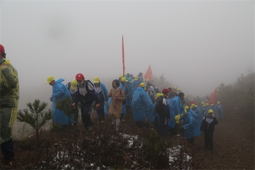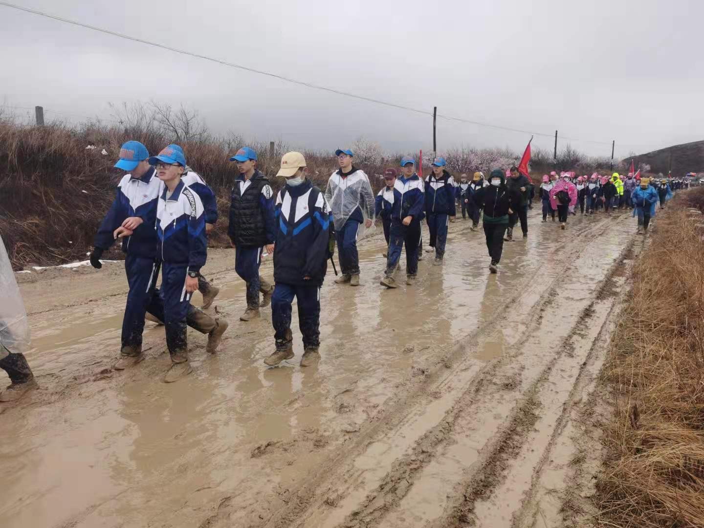 2日凌晨5点多,两校两千多名学生冒着雨雪、踏着泥泞出发。“一路上一会雨一会雪,孩子们深一脚浅一脚,有时鞋子陷到泥泞里都拔不出来,但没有一个人退缩。”弘文中学七年级年级主任殷万香说。