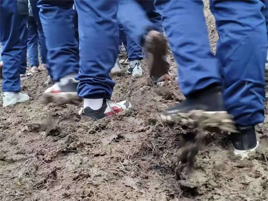 学生的鞋上沾满了泥土。
