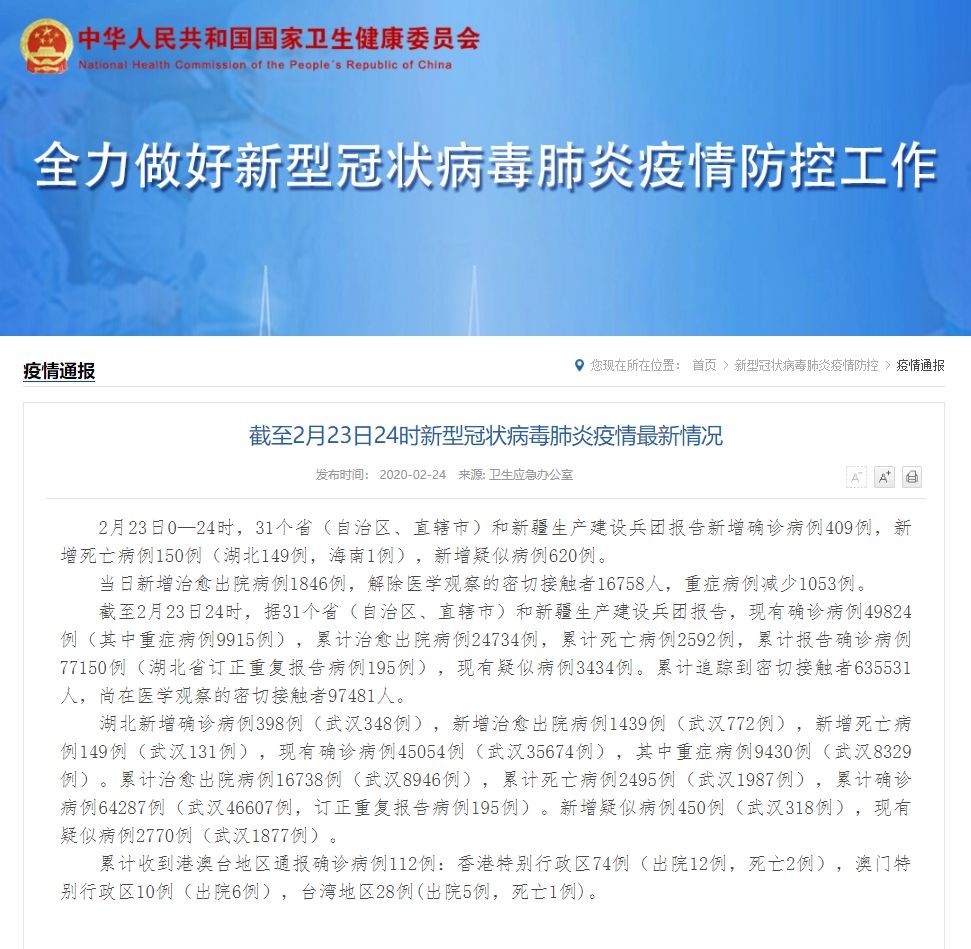 据国家卫健委官网消息,2月23日0—24时,31个省(自治区、直辖市)和新疆生产建设兵团报告新增确诊病例409例,新增死亡病例150例(湖北149例,海南1例),新增疑似病例620例。
