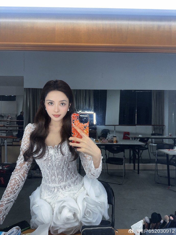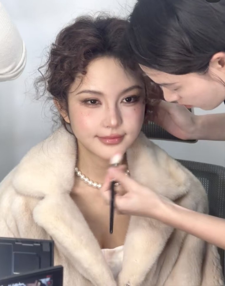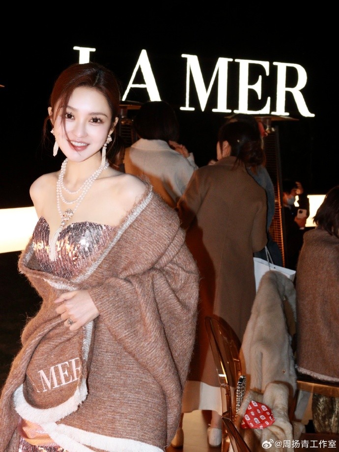 下图里,周扬青侧脸出镜,工作人员正在为她戴锁骨链。虽然是无修图怼脸拍,但可以看到周扬青的脸蛋儿确实是零瑕疵,这个妆容和她的脸蛋儿简直是绝配。