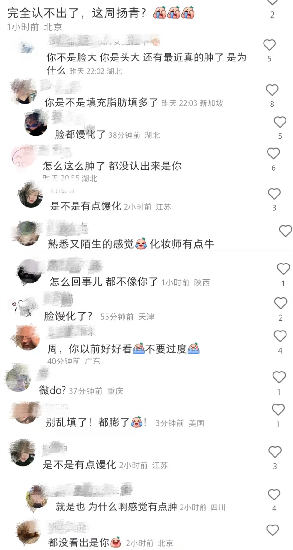 看到周扬青晒出的零修图怼脸后,很多网友都被她的近照给惊讶到了,并且直呼认不出是她本人:“完全认不出了,这周扬青?”“熟悉又陌生的感觉,化妆师有点牛”“都没看出是你”。还有甚者则表示周扬青是不是又动脸了,并喊话她不要过度了:“你是不是填充脂肪填多了”“怎么这么肿了都没认出来是你”“脸馒化了,别乱填了,都膨了”。