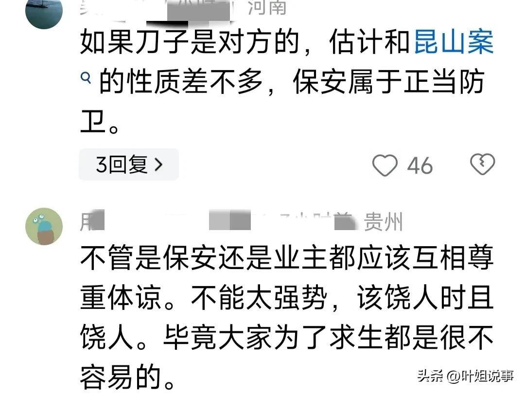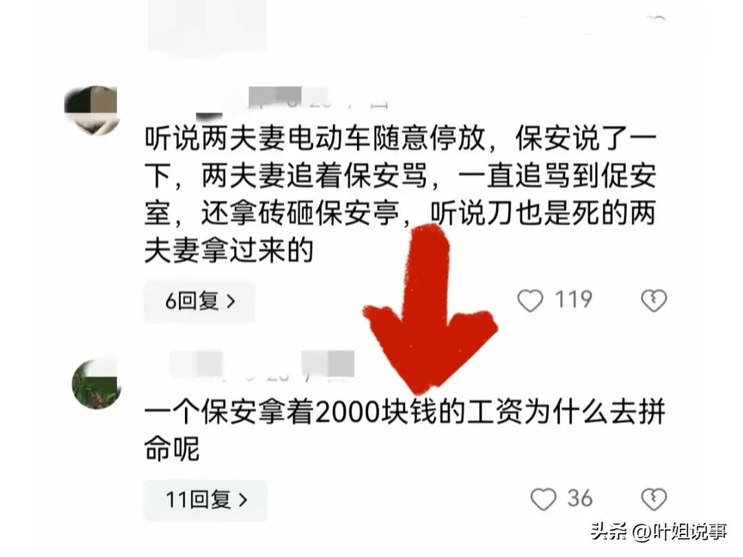 有网友问,“一个保安工资微薄,为啥要舍命杀业主?有网友答,“两口子追着保安又打又骂又砸的,”惹急眼了呗……