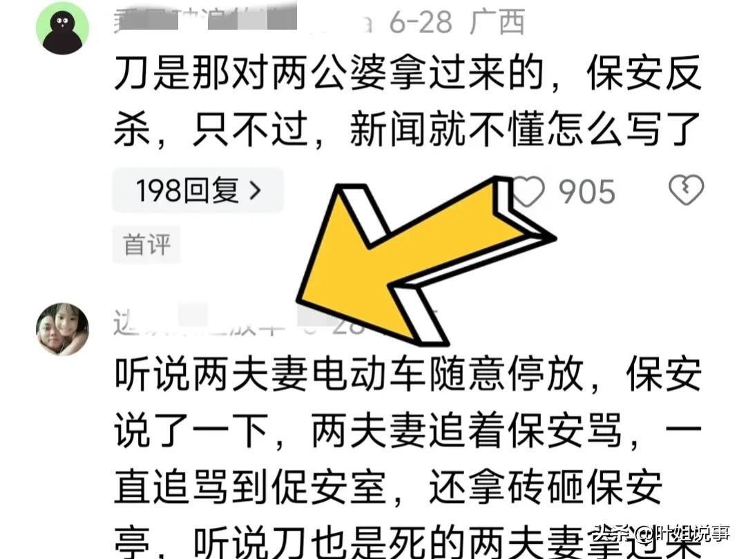 本地网友说,刀是死者夫妻俩自个拿的,听说因电动车随意停放问题被保安说了、结果追着打保安。自己被保安反杀而丢了命。