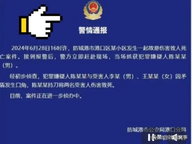 “案发时间为2024年6月28日下午4点,在防城港市港口某小区发生一起凶杀命案。犯罪嫌疑人身份为陈某某;被害者身份为女子王某某与男子李某”。