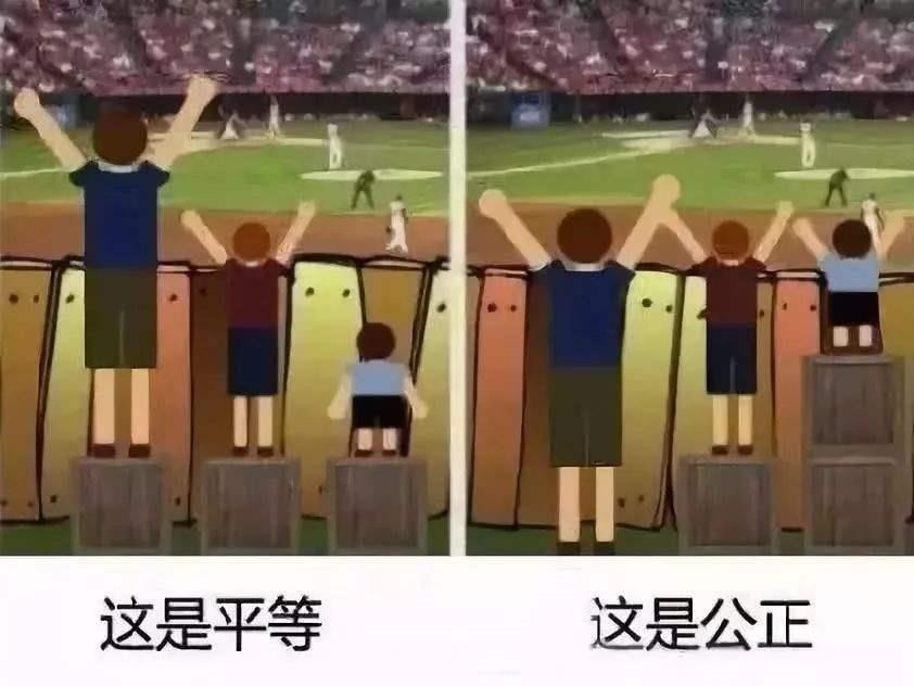 我们常用来讨论公平与公正之间关系的一张图其实也同样可以运用于男女关系的平等上。我认为的性别平等,是在社会根据男女生理及天赋上的特性,进行不完全平均的资源分配之后达到的男性与女性在社会资源及劳动机会无差别共享的境界,并非任何一种权力超过另一种。