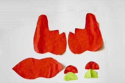 缝制布老虎的制作方法1、剪出布样,如图。大小可以根据自己喜好,小片的是耳朵,长片的是肚子。