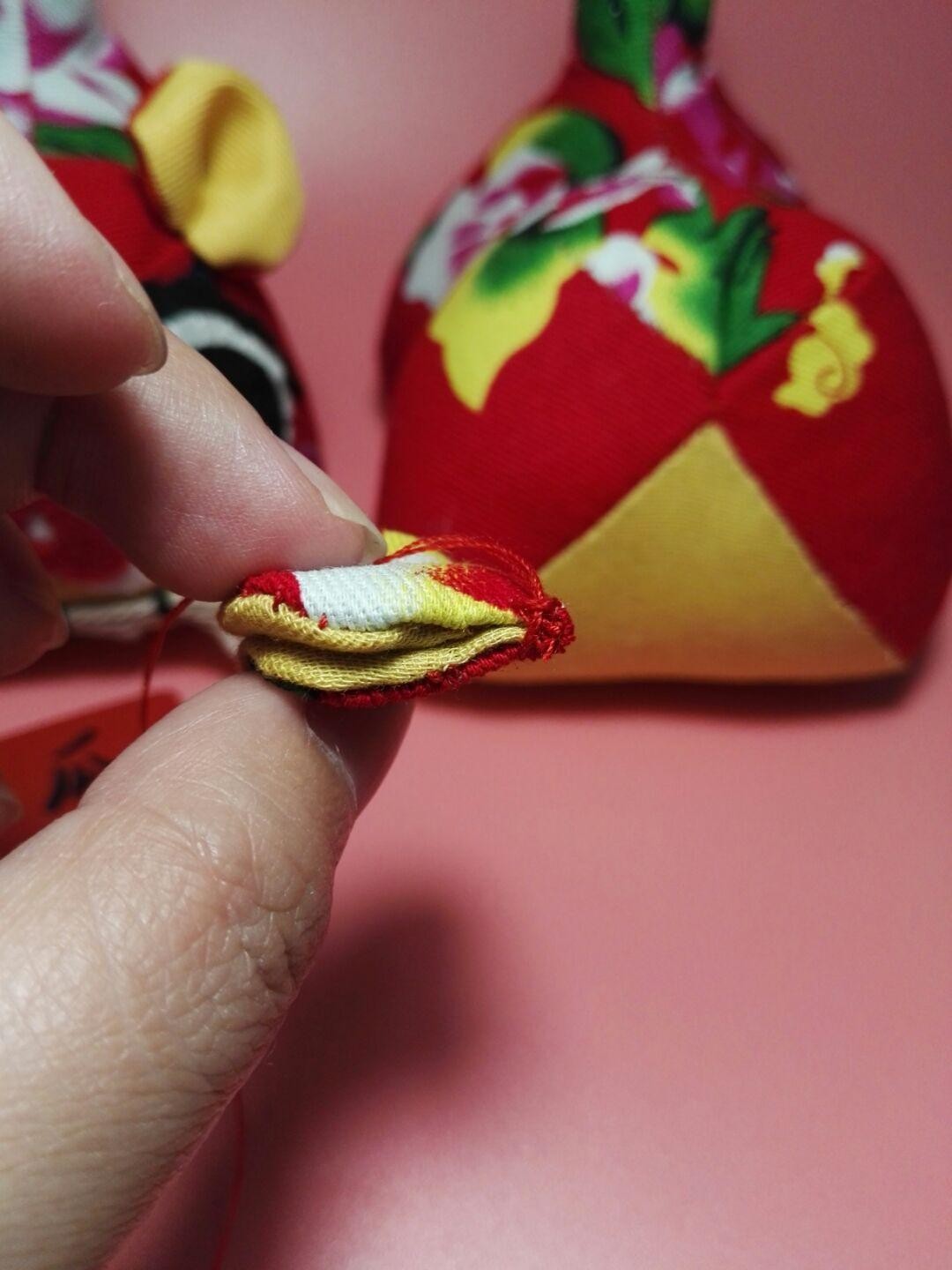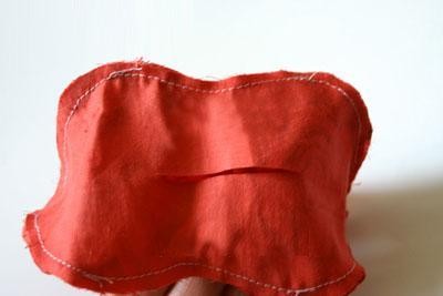 缝制布老虎的制作方法6、缝耳朵的时候将布正面相对,缝合上边,然后再翻到正面缝合底口,抽线拉出褶皱。