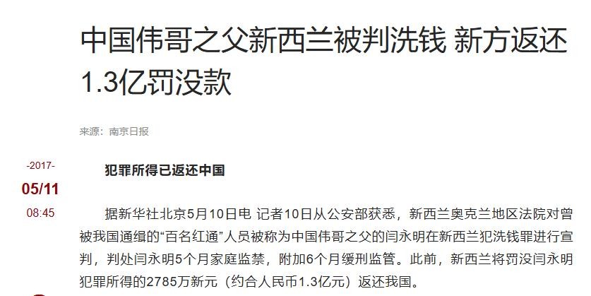 南京日报:中国伟哥之父新西兰被判洗钱 新方返还1.3亿罚没款--2017-05-11