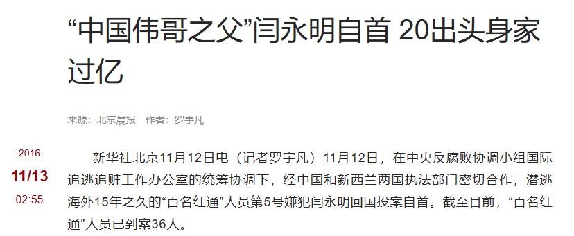 中央纪委检查部网站:“红通”第5号嫌犯闫永明从新西兰回国投案自首的报道--2016-11-12