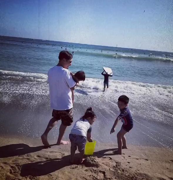 刁磊带着三个孩子到海边玩耍,怀中抱着小女儿的同时,眼神紧盯一旁的七宝和宝妹,平日里何洁忙工作,大部分时间都是一拖三的刁磊,带三个孩子毫无压力。