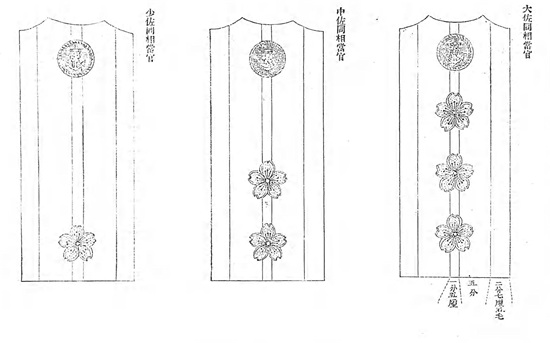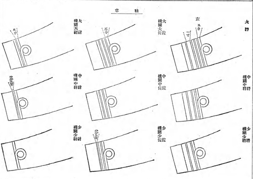 大将为2粗3中,中将为2粗2中,少将为2粗1中;大佐为4中,中佐为3中,少佐为2中1细;大尉为2中,中尉为1中1细,少尉为1中。