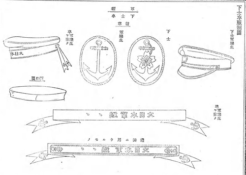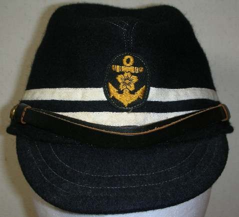 昭和12年(1937年)勅令第614号规定了略帽,第一种略帽为藏青色,军官有两条白色条纹,军士有一条白色条纹。帽章为褐青色底布由金线刺绣而成,军官(包括准尉)和军士帽章为船锚和樱花;水兵帽章为船锚。