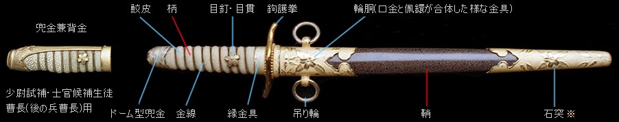 剑柄长4寸3分(约13.092厘米)到5寸(约15.15厘米),剑鞘长2尺3寸(约69.69厘米)到2尺8寸(约84.84厘米)。剑柄表面为白色鲨鱼皮,并缠绕金线。护手为西方样式,并雕刻樱花叶图案。剑鞘木制包括黑色鲨鱼皮或黑色皮革,并带有三个金色金属配件,后两个上有圆形吊环,金色配件上都有樱花叶图案。刀柄护手上缠绕一根剑绪。