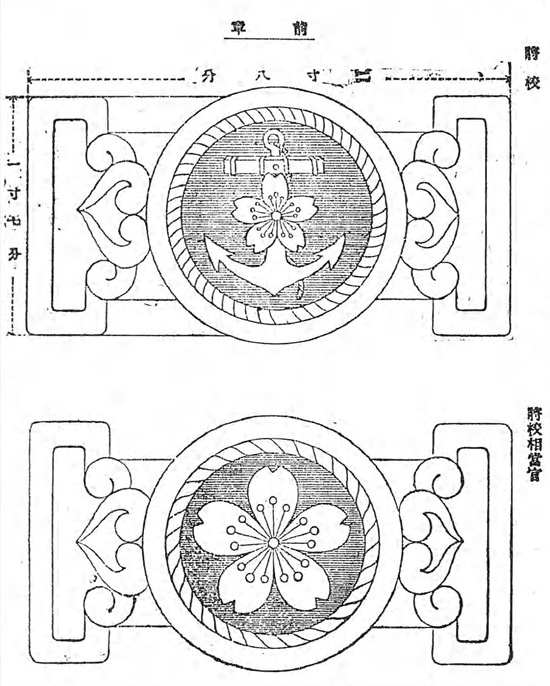 军帽上的帽章长1寸6分(约4.848厘米),宽2寸2分(约6.666厘米)。帽章的底布和军帽颜色一样,中间的救生圈和船锚由金色金属制成,上面的樱花由银色金属制成,四周的樱叶是金线刺绣,叶子上果实是银线刺绣。