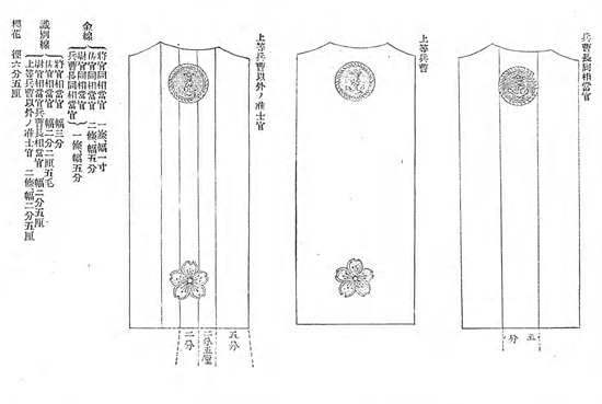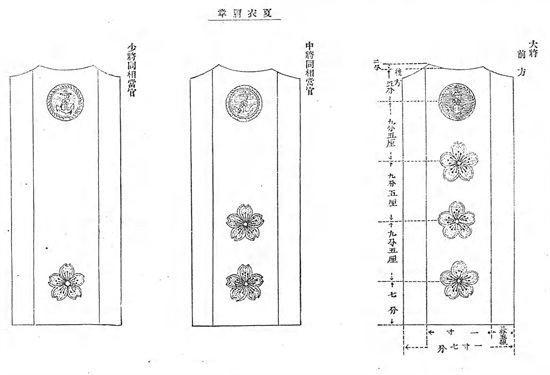 正服袖口的袖章使用金色,用条纹代表军衔。共有三种粗细尺寸的条纹:细线2分5厘(约0.575厘米),中线5分(约1.515厘米)和粗线1寸(约3.03厘米)。