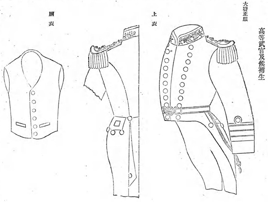 明治16年(1883年)将翻领燕尾服定为礼服,但在明治20年(1887年)取消了该规定,以佩戴正肩章的大衣代替,被称为“礼服上衣”。明治26年(1893年)12月27日正式规定礼服上衣为双排扣大衣。
