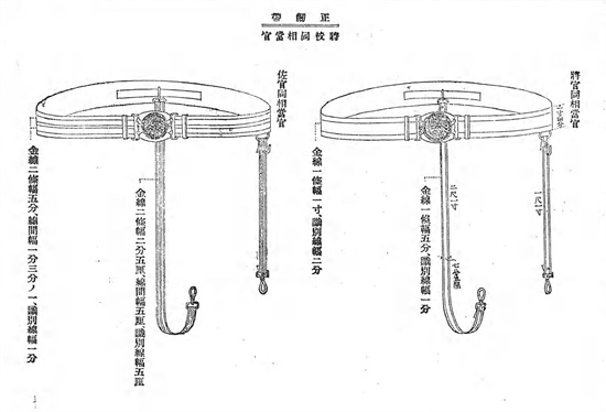 正剑带由皮革制成,左侧有两条悬挂配件的带子。将官的正剑带表面有一条1寸(约3.03厘米)宽的金线,佐官为两条5分(约1.515厘米)宽的金线,尉官为1条5分(约1.515厘米)宽的金线。