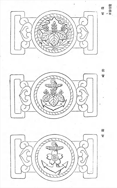 将官正肩章从纽扣处开始为五七桐,两个山形线和樱花(在椭圆形盘),其中三个樱花呈三角排列为大将,两个樱花竖直排列为中将,一个樱花为少将。佐官正肩章从纽扣处开始为五三桐,樱花和船锚(在椭圆形盘),其中大佐为两个樱花竖直排列,中佐为一个樱花,少佐无樱花。尉官正肩章从纽扣处开始为樱花和船锚(在椭圆形盘),其中大尉为一个樱花加穗带,中尉为一个樱花无穗带,少尉为无樱花无穗带。