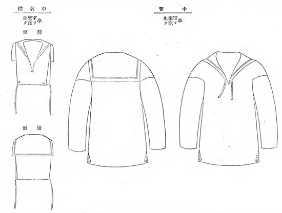 水兵夏装为白色水兵服,衣领为深蓝色,边缘有宽3分的白线。水兵夏装袖口和下摆都有深蓝色小仓织(一种棉织物)边缘。佩戴一条黑色领巾。