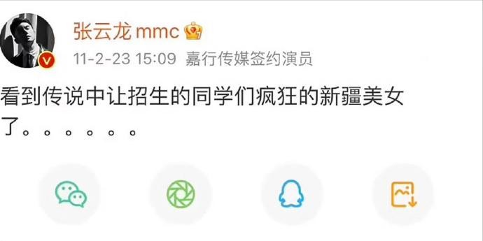张云龙2011年,还发了夸赞娜扎的美貌言论,内容表示:看到了传说中让招生的同学疯狂的新疆美女了。。还连发六个句号,可见果然是令人见之疯狂的美貌啊。