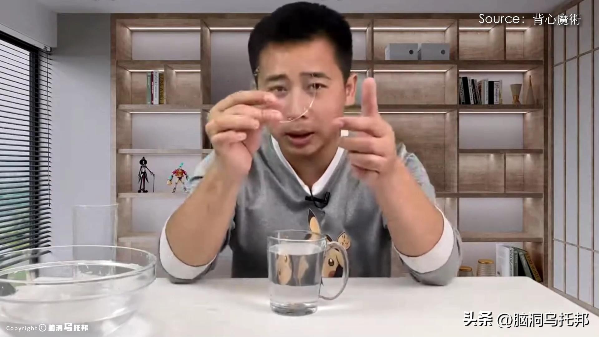 关于空杯来酒的的把戏,B站Up主「背心魔术」做出了这样的破解:说是用一个透明薄膜压进杯中,这样即使杯子倒过来,酒也不会洒出来。