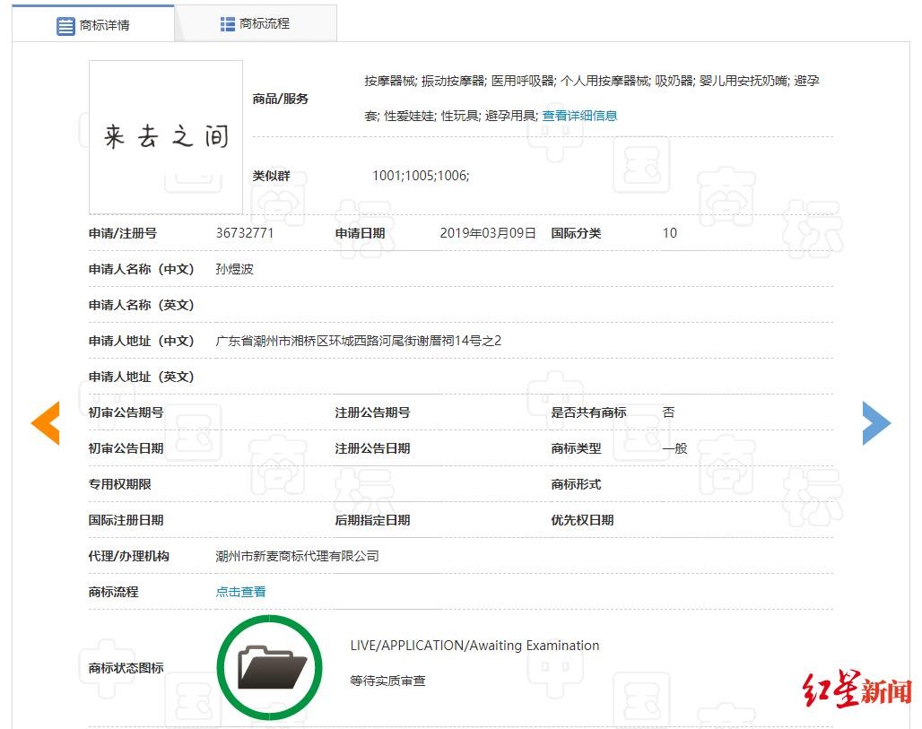 8月6日晚,有网友发现,微博CEO王高飞也没有逃过网名被抢注的命运。其微博名“来去之间”在今年三月也被被注册成商标,商标用途还是成人用品。红星新闻记者在国家知识产权局商标局上搜索发现,“来去之间”由广州潮州市的某公司注册,申请时间是今年的3月9日,商标属类是成人用品。而另一个“来去之间”商标属类是新鲜水果、新鲜蔬菜等,由浙江绍兴市某公司注册,申请时间是2018年12月10日。