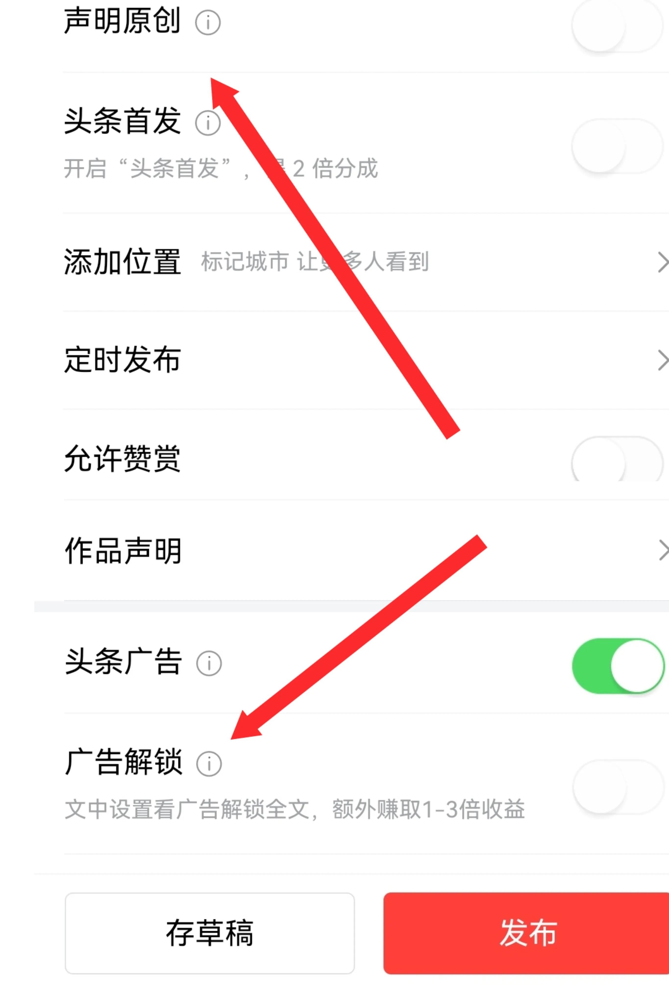 头条文章在进行发布时,可以勾选原创和首发功能,还可以勾选头条广告,如果有广告解锁功能也可以勾选,这样收益会更多。