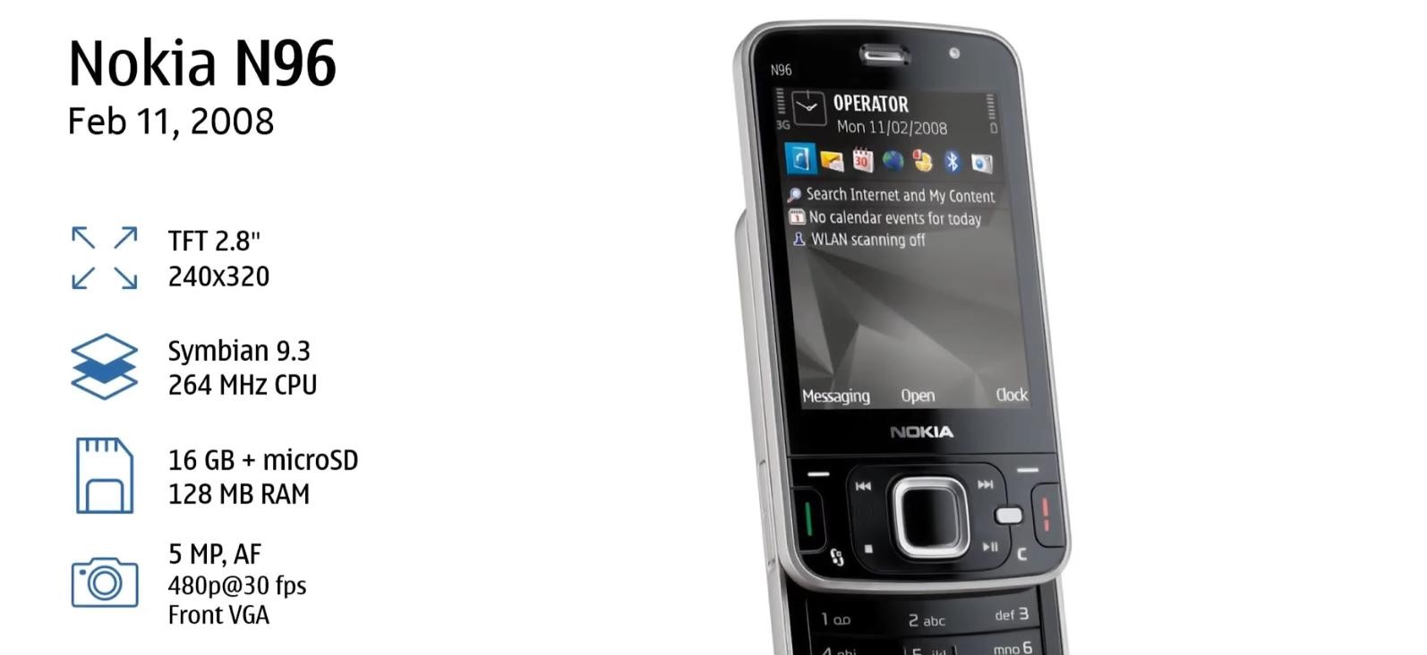 诺基亚N96 搭载了Symbian9.3 S60 v3智能手机系统,使用128兆的RAM+256兆的ROM得内存组合方式,支持Micro SD卡扩展至16GB。但N96 CPU也只有孱弱的264兆赫兹,使得它虽然作为诺基亚高端系列的旗舰机,却显得没那么旗舰。机身尺寸为103×55×20mm(真的是厚啊),重量 125.0g,有黑色和白色两种颜色供用户选择。