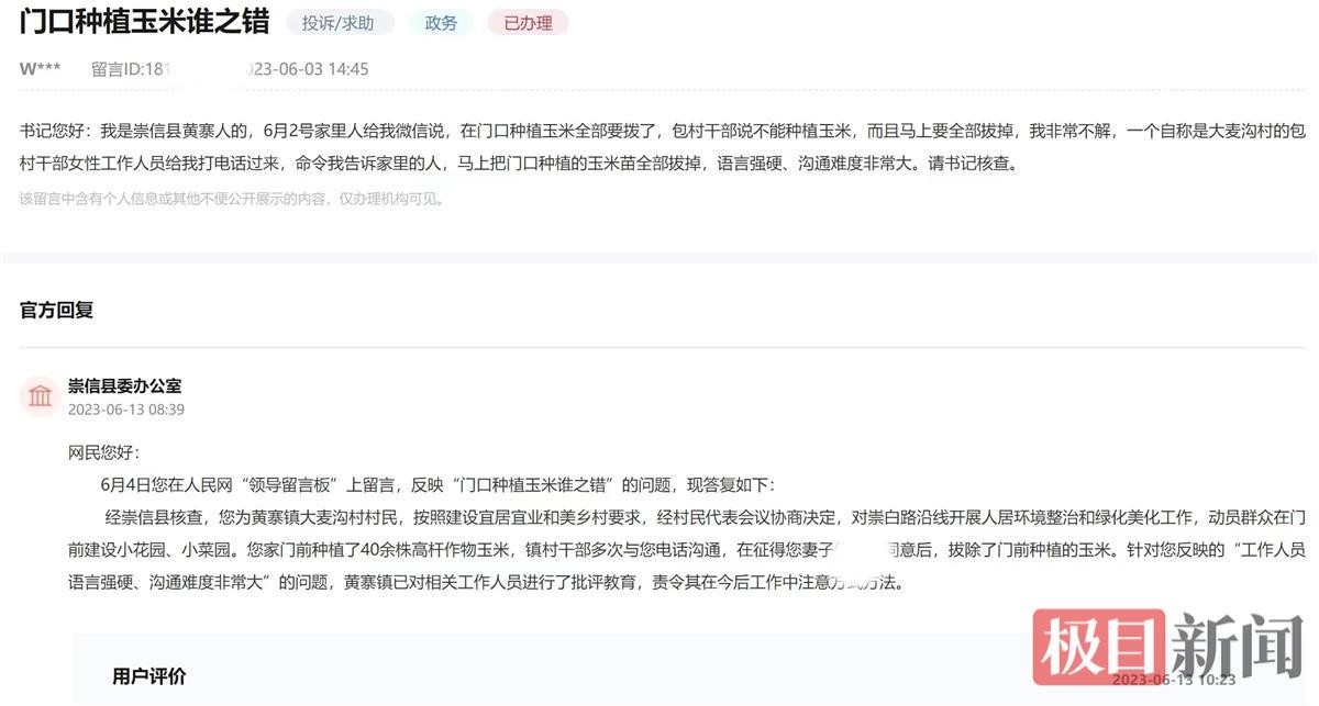 极目新闻记者注意到,崇信县政府办公室、县委办公室此前在人民网“领导留言板”上回复李先生称,按照建设宜居宜业和美丽乡村要求,经村民代表会议协商决定,对崇白路沿线开展人居环境整治和绿化美化工作,动员群众在门前建设小花园、小菜园。留言人家门前种植了40余株高秆作物玉米,镇村干部多次与留言人电话沟通,在征得留言人妻子同意后,拔除了门前种植的玉米。