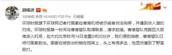 环球时报旗下环球网记者付国豪在香港机场被示威者非法拘押,并遭到非人道的对待。环球时报第一时间与香港警队取得联系,请求救援。香港警队克服巨大困难进入机场,在大约北京时间14日凌晨0点20分许,我们得到消息,香港警队已将付国豪救出。国豪在被救出时躺在担架上,头上有很多血,他显然遭到了野蛮殴打。