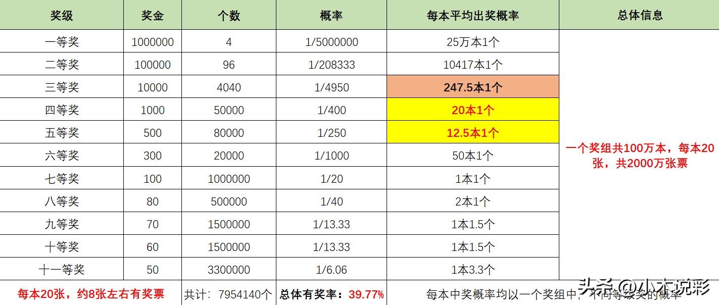 一个奖组共100万本,共计2000万张票。一个奖组中设一等奖4个,奖金为100万元,中奖概率是500万分之1。一个奖组中设二等奖96个,中奖概率是208333分之1。