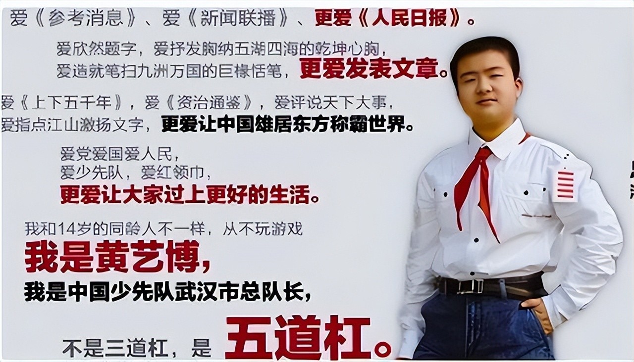 如今搜来黄艺博的名字,便依旧是那张带有红领巾,胳臂上带有“五道杠”的勋章,被人戏谑“官相”的照片。