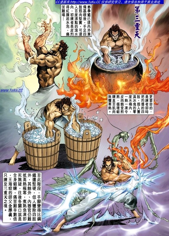 邪拳道已达内外兼备基础后,手足四肢筋肉坚实,可浸入百度沸点的滚水内,初练者表皮灼得红肿起水泡,痛苦难堪… 更要命的,是练者即时把灼伤的四肢,插入置满冰块的零度水桶内,一热一冻令皮肤饱受煎熬,循环锻炼直至肌肉无惧寒热。至此阶段,手脚变得比钢铁还坚硬,但人体除四肢外,其余外、内器官仍难抵高热极寒,煮熟急冻即死无疑,往后各关口就是全身锻炼,痛苦艰辛数倍。