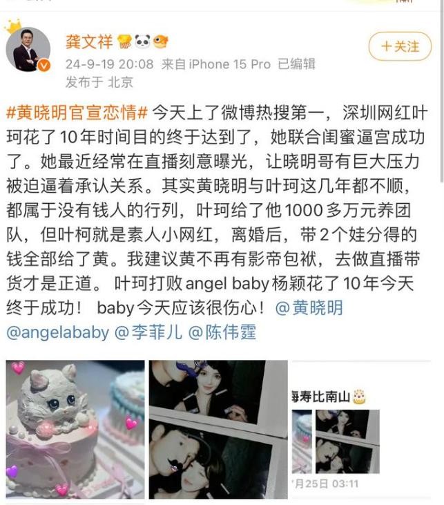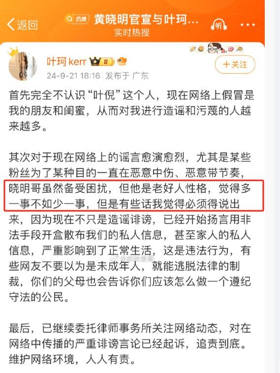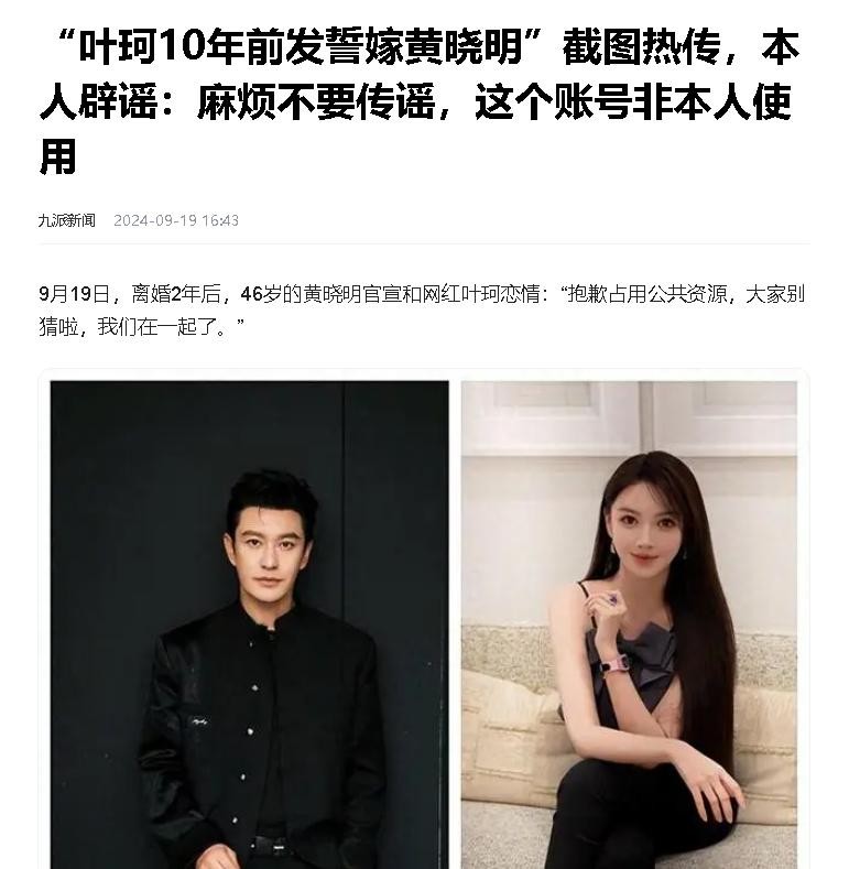 信息来源:九派新闻 2024-09-19“叶珂10年前发誓嫁黄晓明”截图热传,本人辟谣:麻烦不要传谣,这个账号非本
