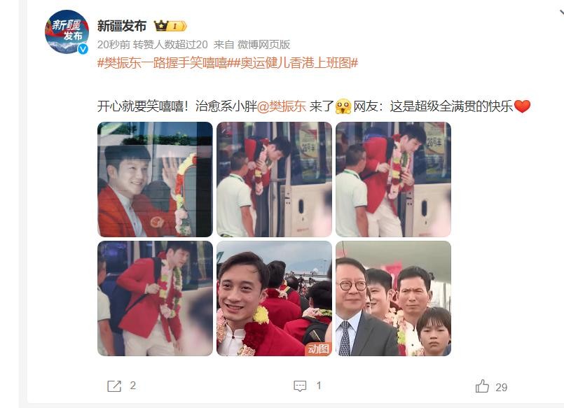 奥运冠军访港媒体见面会上,樊振东表示自己第一次跟随代表团访港特别期待。看到自信大方、表达流畅的东哥,网友表示:“意气风发少年郎”在樊振东身上具象化了。