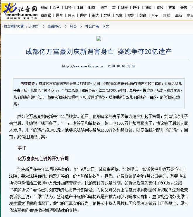 《成都富豪被杀引20亿元官司 婆媳对簿公堂争遗产》2010年10月15日《青岛新闻网》