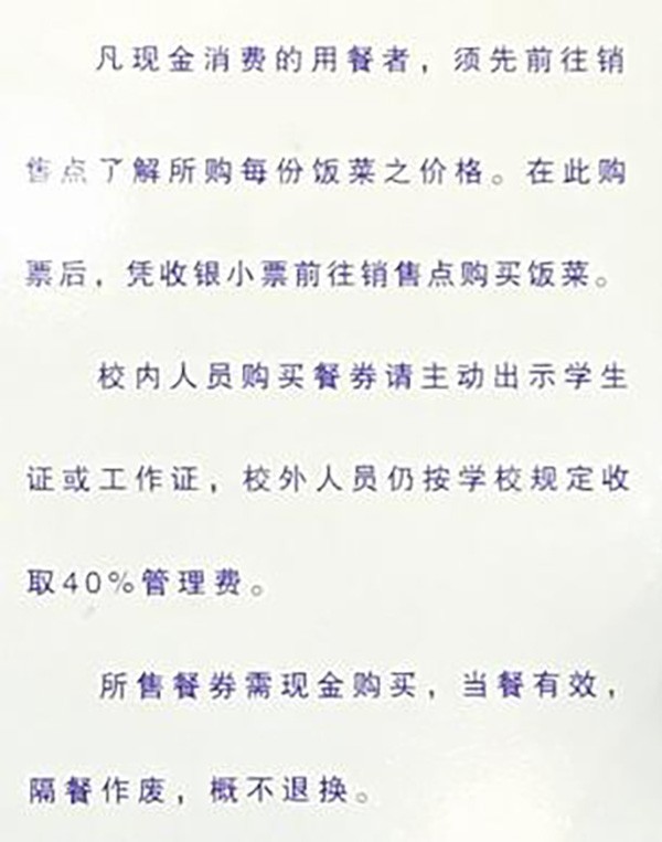 在食堂一角的收银处,记者看到南京大学后勤服务集团膳食中心贴出的告示。现金消费的用餐者需要在此购买餐券,再前往销售点购买饭菜。校外人员按学校规定收取40%管理费。在此收银的工作人员告诉记者,每天来购券的校外人员挺多的,卖出数十张不成问题。