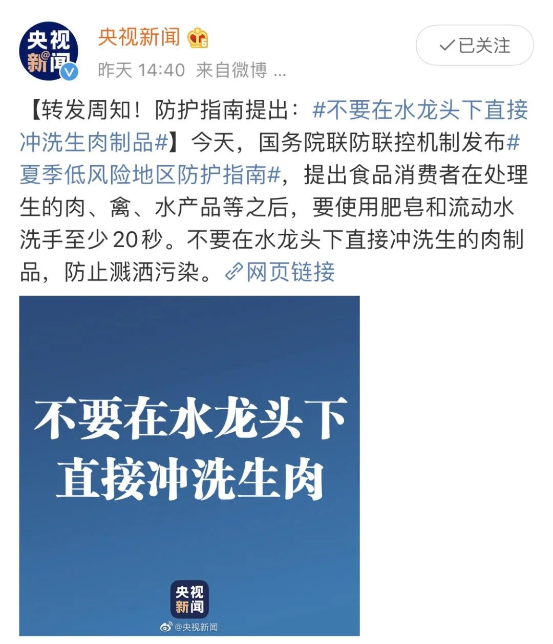 昨日,国家卫健委发布低风险地区夏季防控指南,其中特别提出“不要在水龙头下直接冲洗生的肉制品,防止溅洒污染”。