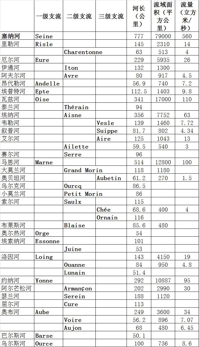 1、小塞纳河-从源头到蒙特罗福约讷的约纳河口,主要支流有乌尔塞河(右)、巴尔斯河(右)、奥布河(右)等。其中奥布河最大,河长249公里,流域面积3600平方公里,流量34立方米/秒。