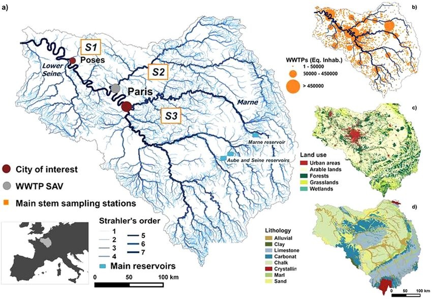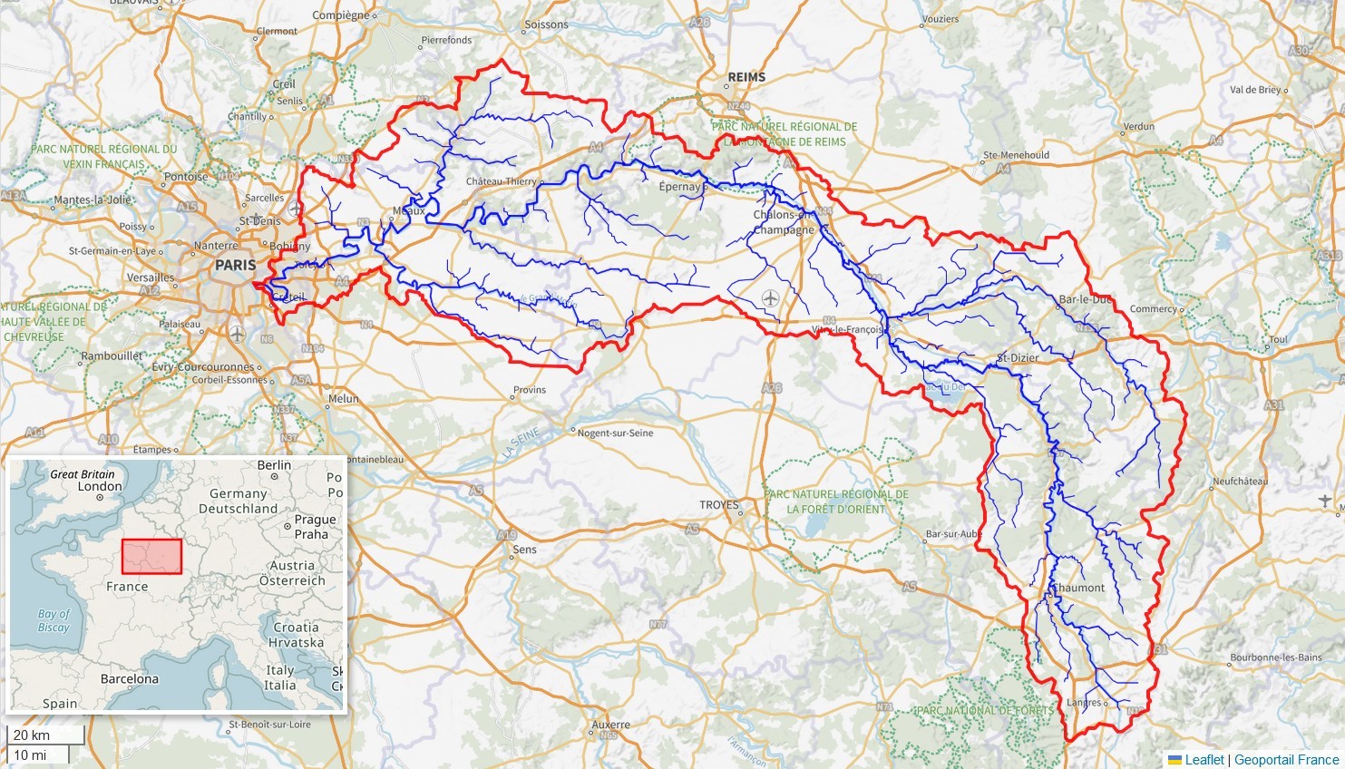 塞纳河全长777公里,流域面积为78910平方公里,法国境内面积78650平方公里,还有260平方公里在比利时境内。塞纳河的支流中流域面积大于1万平方公里的有三条,分别是:瓦兹河,马恩河,约纳河。流域中2%是森林,78% 是耕地。除巴黎外,塞纳河流域内还有另外三个人口超过10万的城市:河口的勒阿弗尔、塞纳河谷的鲁昂和北部边界的兰斯,人口密度为每平方公里201人。