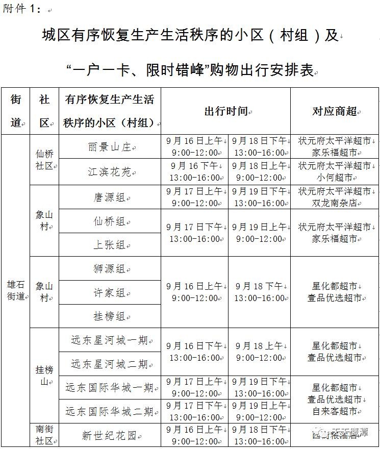 附件:1.城区有序恢复生产生活秩序的小区(村组)及“一户一卡、限时错峰”购物出行安排表