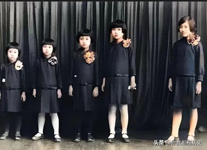 1927年,蒋英和4位姐妹的合影,这年蒋英才7岁,她和姐妹穿着统一的服装,按照年龄依次站队。从右向左分别是大姐蒋昭,二姐蒋雍,蒋英,四妹蒋华,五妹蒋和。她们5人天生丽质,命运却各不相同。