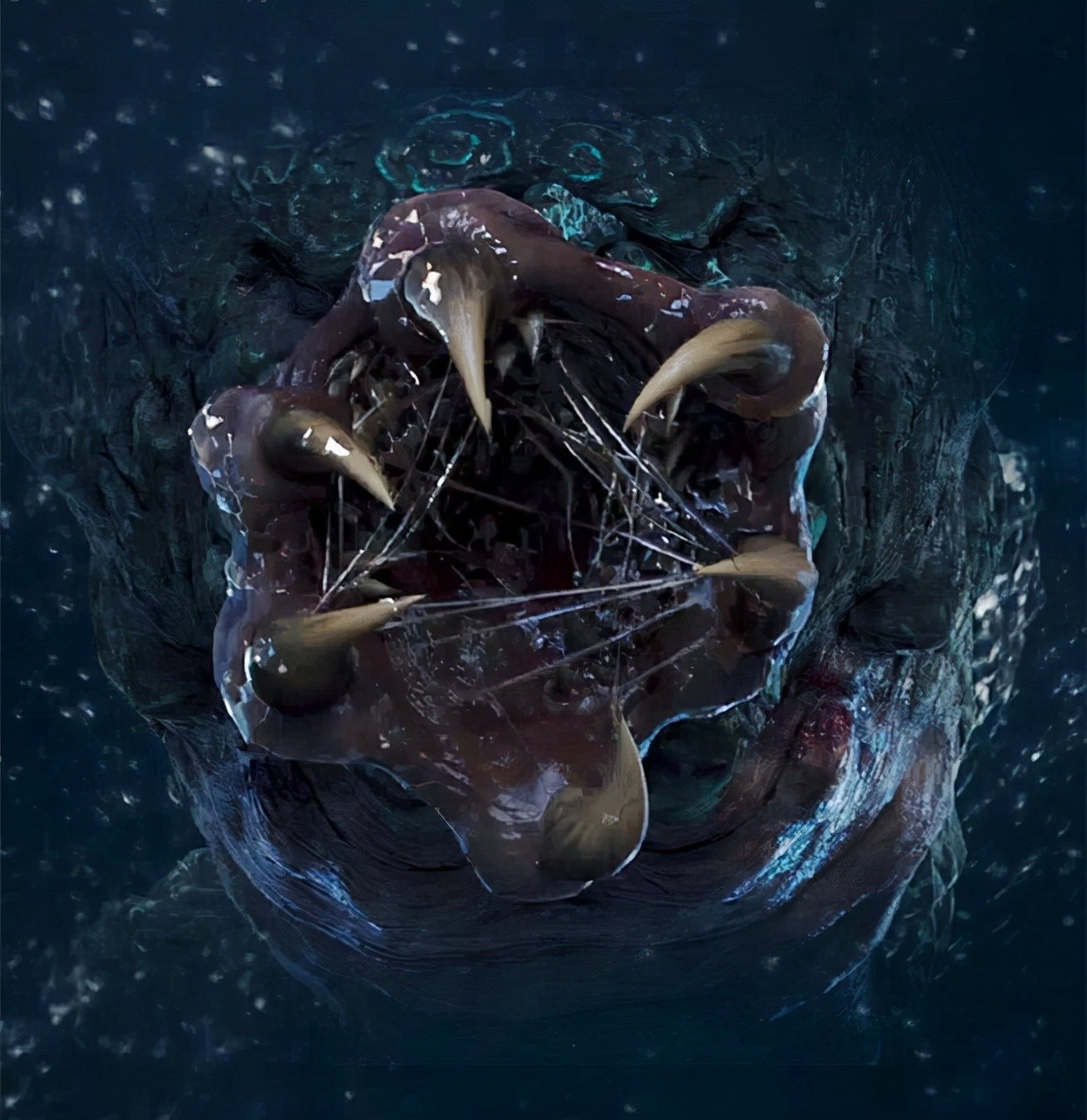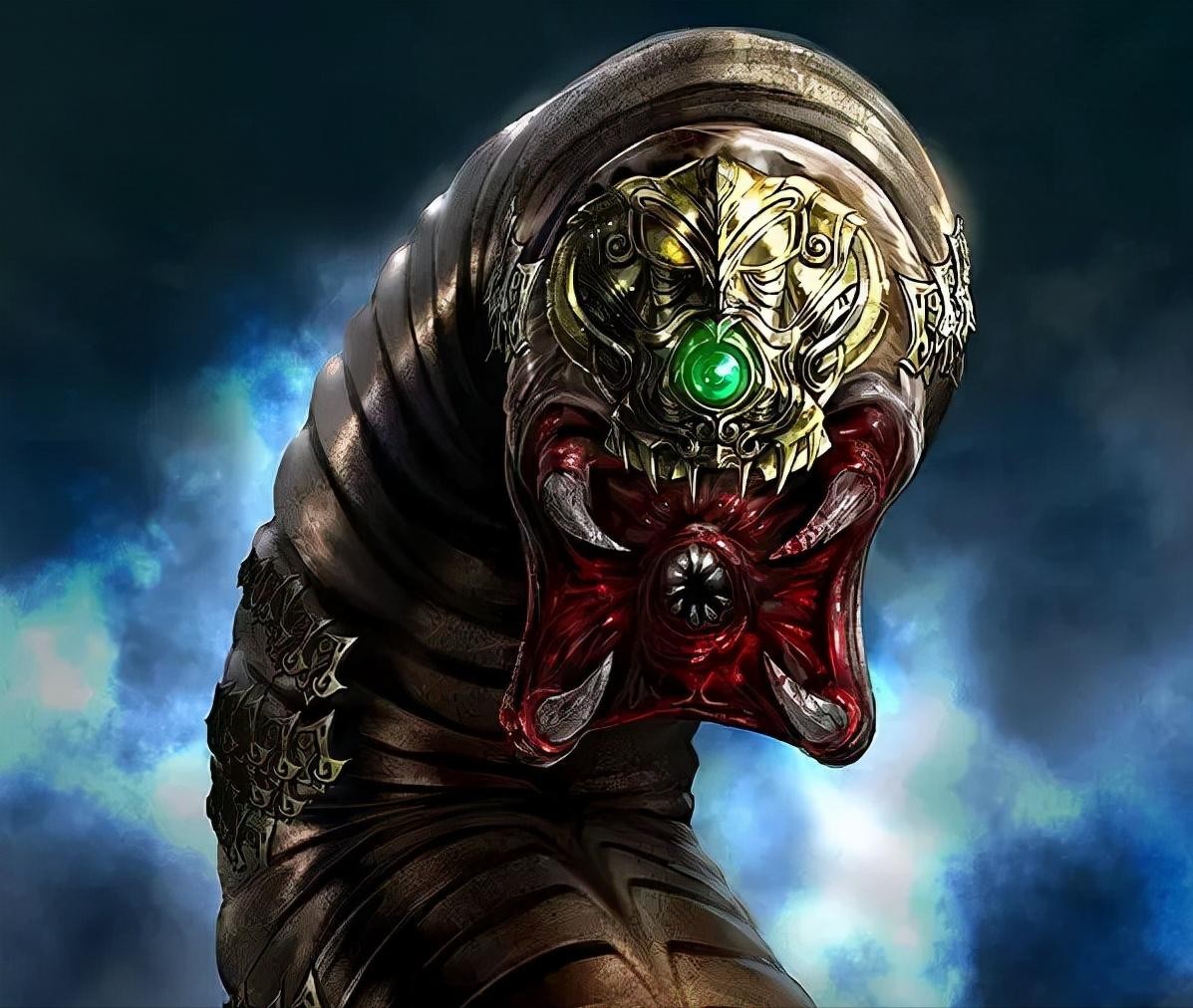 剧中的霍氏不死虫体型巨大,如同身披金刚铠甲,子弹都打不穿。头部有一只眼睛,口中不是常见排状的猛兽獠牙,而是在口中有圆形一圈尖牙,出现还伴随着红雾,恐怖又诡异。